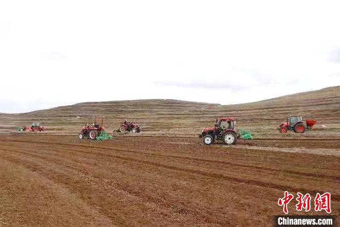 圖為同仁市黃乃亥鄉(xiāng)正在機(jī)械化種植黑青稞?!√旖蛟嘀笓]部供圖