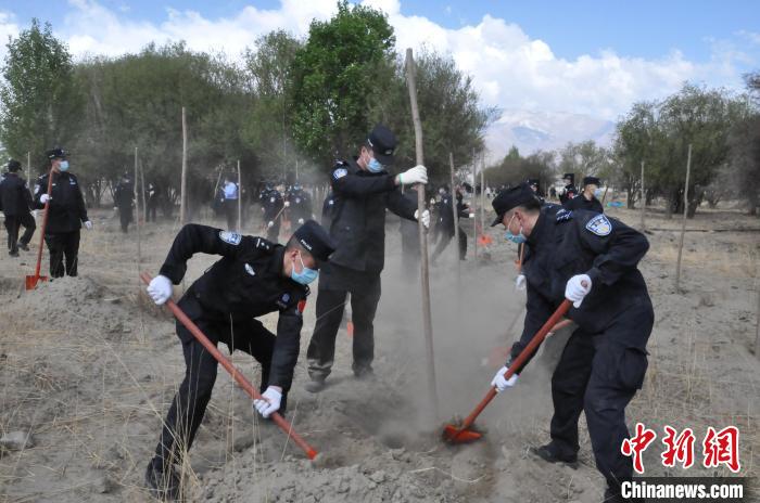 圖為西藏邊檢總站輪訓(xùn)大隊(duì)民警植樹(shù)活動(dòng)現(xiàn)場(chǎng) ?!∥鞑剡厵z總站輪訓(xùn)大隊(duì)供圖