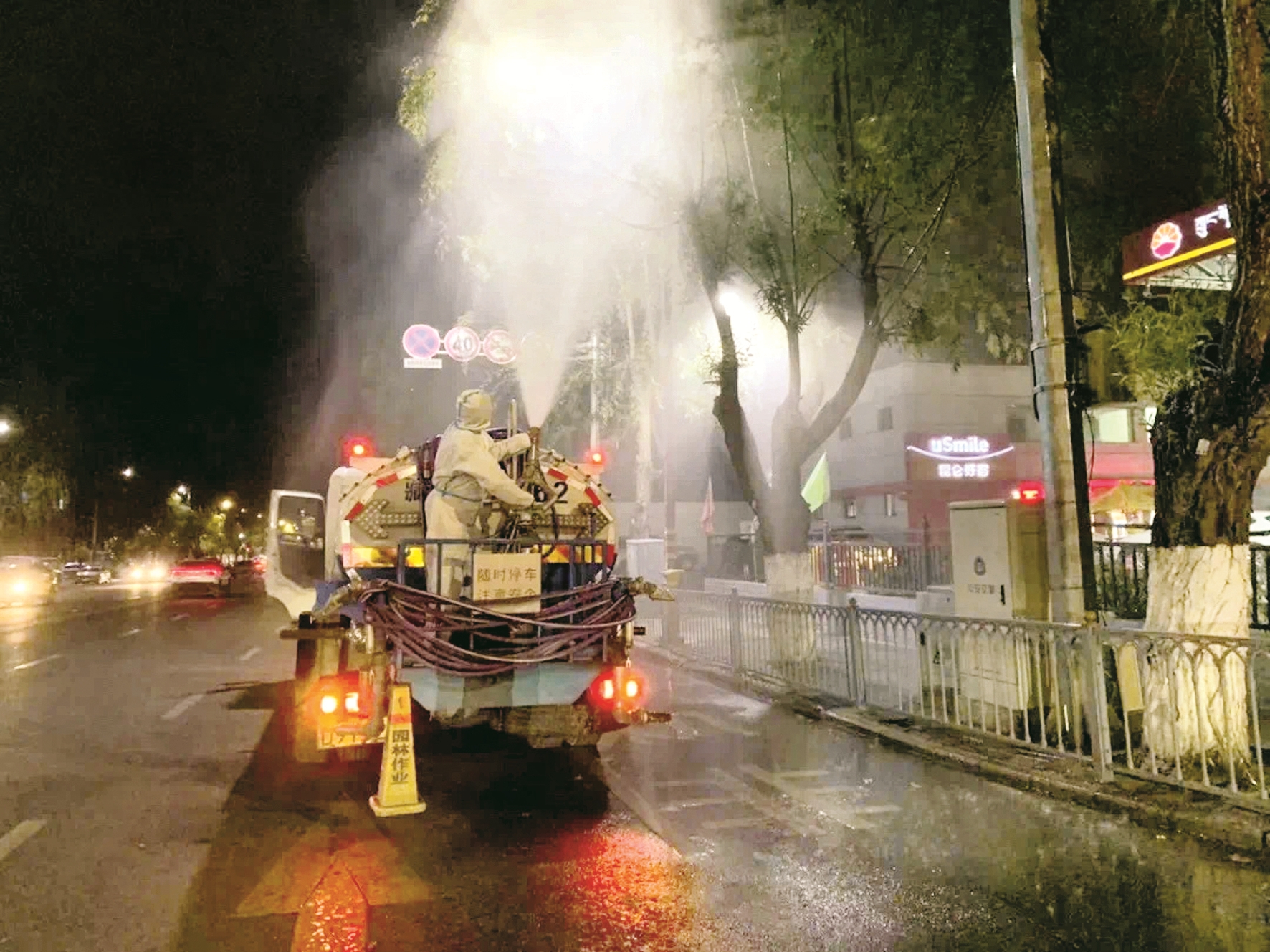 圖為園林公司工作人員正在對(duì)道路兩旁樹木進(jìn)行噴藥作業(yè)。 拉薩融媒記者 次仁卓嘎攝