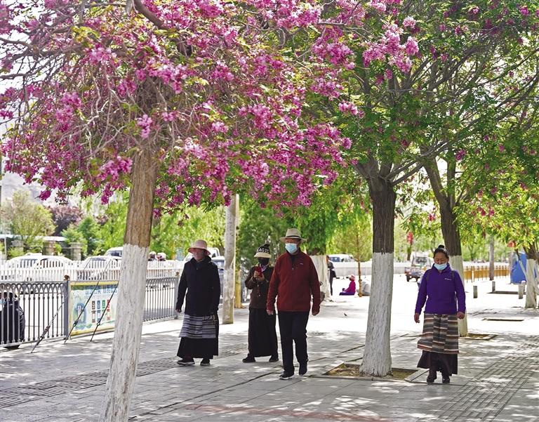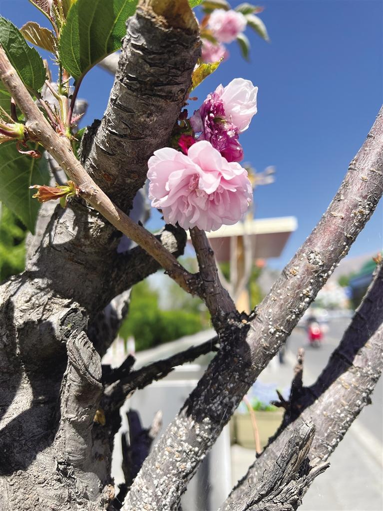 如今,走在市區(qū)街頭或公園,隨處可以看到開花的樹種,有的已經(jīng)凋零,有的開得正艷,有的含苞待放。在布達拉宮腳下的北京中路道路兩側(cè)櫻花全面盛開,粉紅色的櫻花宛如云霞,花瓣隨著微風(fēng)簌簌落下,煞是浪漫。將初夏的北京中路裝扮成一幅美麗的畫卷,吸引許多市民和游客賞花拍照。