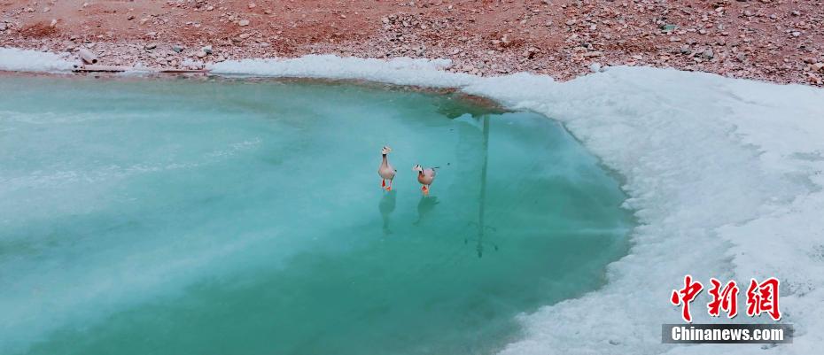 立夏以來,在位于祁連山國家公園內(nèi)的青海省海北藏族自治州祁連縣,當?shù)孛癖娕臄z到多種野生動物活動影像。圖為斑頭雁在冰面行走。