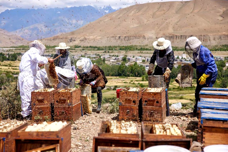 經(jīng)過幾年努力,來自貴州的養(yǎng)蜂人張亮富在山南市建起了一座蜜蜂文化主題生態(tài)體驗園,為當(dāng)?shù)匕傩諑砹恕疤鹈邸?。今年,他與當(dāng)?shù)?個縣開展蜜蜂養(yǎng)殖合作,投放蜜蜂2100余箱,建成64個養(yǎng)蜂點,預(yù)計年產(chǎn)值3200萬元?!袄习傩赵诩揖涂梢酝瓿擅鄯漯B(yǎng)殖,更能安心守護家園。”張亮富說。