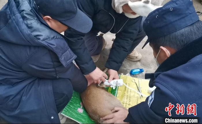 圖為移民管理警察與獸醫(yī)站人員為赤麂包扎傷口。 肖應(yīng)天 攝
