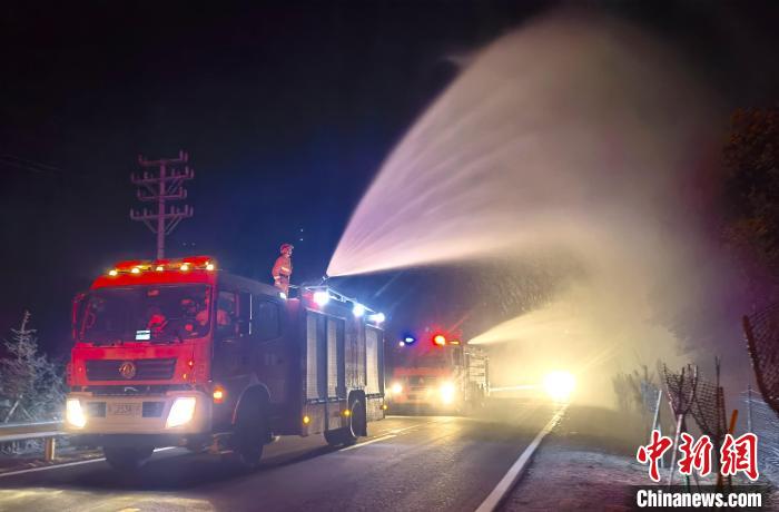 圖為森林消防員正在進行灑水增濕作業(yè)?!×种ナ猩窒拦﹫D