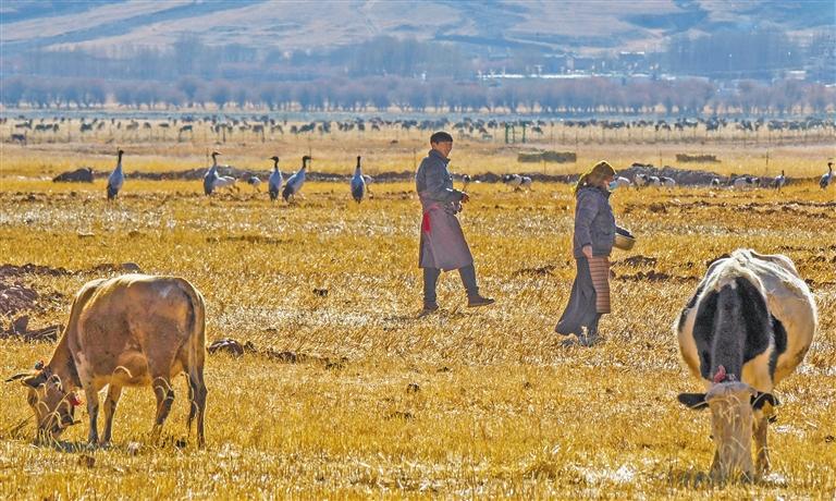 卡孜濕地是其中一個投食點(diǎn)?,F(xiàn)年43歲的洛桑次旦就住在附近,每天一大早,他都會到卡孜濕地放牧?!啊従印絹碓蕉嗔?,十幾年的時間,黑頸鶴的數(shù)量從幾只增長到幾百只。”洛桑次旦告訴記者,黑頸鶴和牛各吃各的,互不干擾,非常和諧。