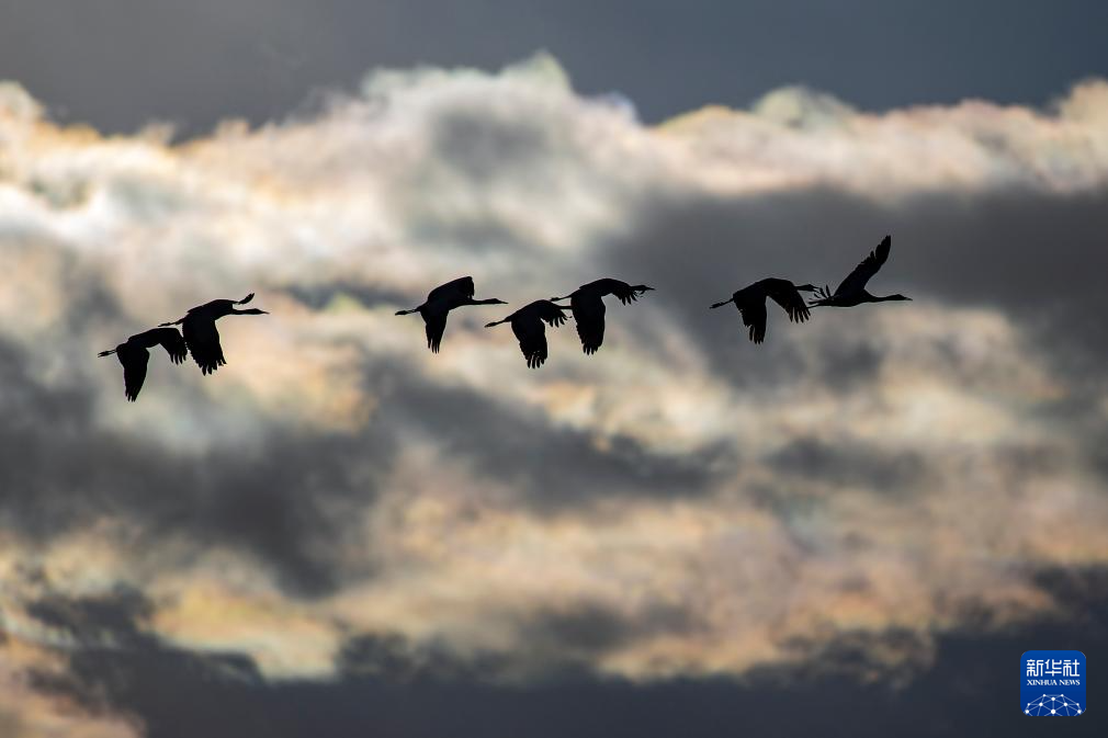 這是12月5日清晨在拉薩市林周縣虎頭山水庫拍攝的越冬黑頸鶴。新華社記者 姜帆 攝