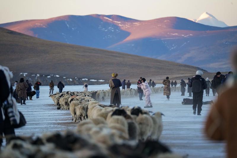 年復一年,驚艷又震撼的“冰上趕羊”盛宴,在普莫雍措已上演了千年。這一獨特的自然人文景觀構成了冬日里絕美的風景,也吸引著眾多游客前來打卡。