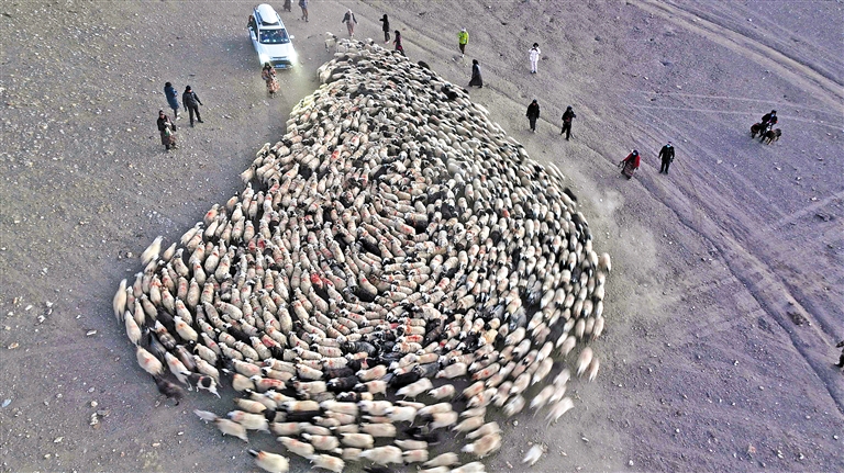 隨著趕羊進(jìn)度加快,“一”字形的羊群隊伍逐漸拉長。浩浩蕩蕩的羊群用它們的身姿勾勒出一條緩緩移動的金線,為這片蔚藍(lán)透亮的冰湖增添了生命的靈動。