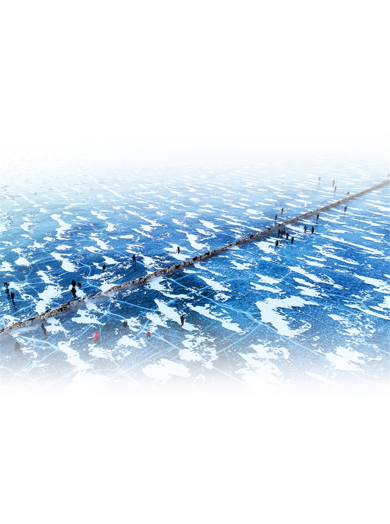 行進(jìn)到一半時,太陽開始升起。初升的暖陽斜照在冰面上,把羊群染成了鵝黃色,如一朵朵黃云浮在藍(lán)冰上,它們?yōu)⑾碌挠白右才狭私鸸狻?/p>