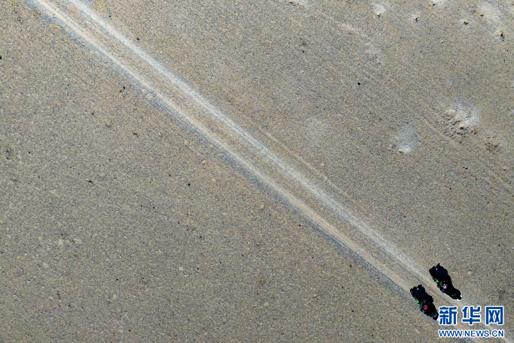 4月14日,野保員在色林錯(cuò)國(guó)家級(jí)自然保護(hù)區(qū)進(jìn)行日常巡邏(無人機(jī)照片)。新華網(wǎng) 旦增努布 攝