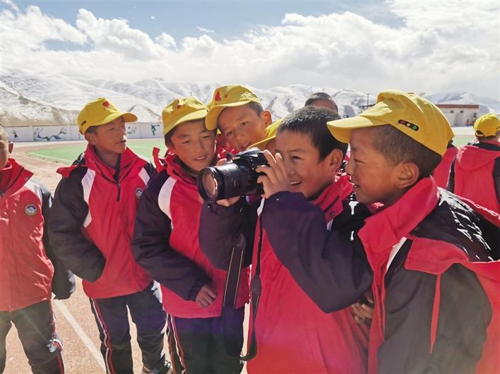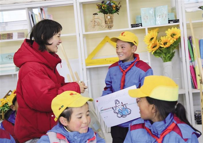 美術(shù)教室布置之初,從一年級(jí)到六年級(jí),二三十名學(xué)生追到新教室,拿著彩筆在墻上畫出一幅幅稚嫩卻充滿童趣的圖畫。“我想畫一個(gè)城堡,給它圖上美麗的顏色!”“我要把牦牛畫在墻上。”“我要畫個(gè)飛行員”……