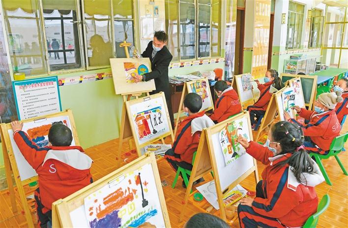 圖為買巴鄉(xiāng)小學(xué)學(xué)生正在課堂上以繪畫(huà)的方式表達(dá)對(duì)偉大祖國(guó)的熱愛(ài)之情。記者 唐斌 次旺 攝