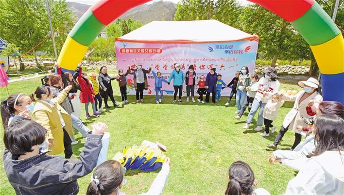 圖為柳梧新區(qū)管委會的干部和孩子們做游戲。 記者 潘多 次旺 攝