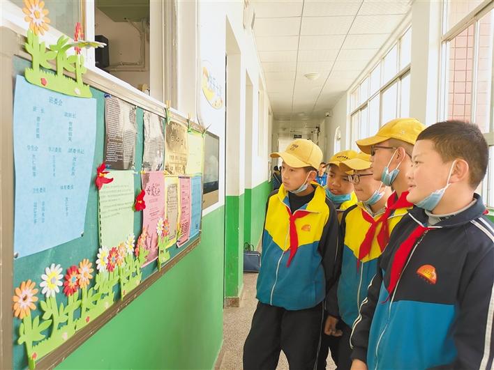 圖為桑珠孜區(qū)第二中學(xué)初二學(xué)生在教師走廊參觀學(xué)習(xí)班級動(dòng)態(tài)展板。 記者 扎西頓珠 攝