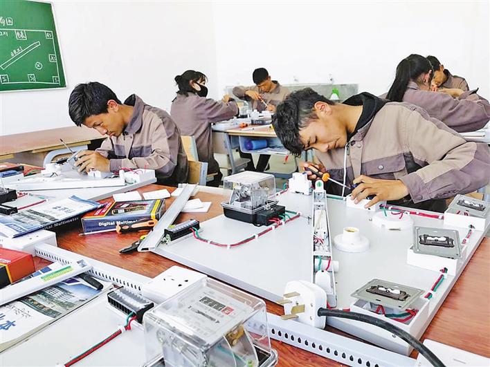 西藏技師學(xué)院的學(xué)生們在上電工實(shí)訓(xùn)課程,為將來走上工作崗位奠定基礎(chǔ)。記者 孫文娟 攝