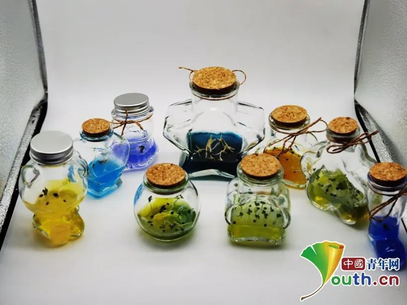 在形態(tài)各異的玻璃罐里,裝著色彩斑斕的培養(yǎng)基,上面孕育著排列工整的幼苗,十分精致。記者了解到,這些看似相同的植物苗,實(shí)際上包含了油菜、小麥以及大豆三個(gè)不同品種,更是此專業(yè)老師的研究成果。其中,油菜品種是該專業(yè)老師郭世星用于景觀美化的育成品種紫葉油菜,小麥?zhǔn)菍I(yè)負(fù)責(zé)人蒲至恩新育成的紫色和藍(lán)色品種,大豆是該專業(yè)老師武曉玲的育成品種,具有耐蔭特點(diǎn)。“我們想送給新生一份有意義的見面禮,增加大家對這個(gè)專業(yè)的歸屬感。”蒲至恩說。