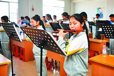 湖南省湘西土家族苗族自治州瀘溪縣第五中學(xué)的學(xué)生在練習(xí)演奏笛子。王將攝/光明圖片
