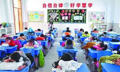 圖為10月21日,淮安山陽(yáng)湖小學(xué),中午沒(méi)回家的學(xué)生在教室午睡。丁幼華攝