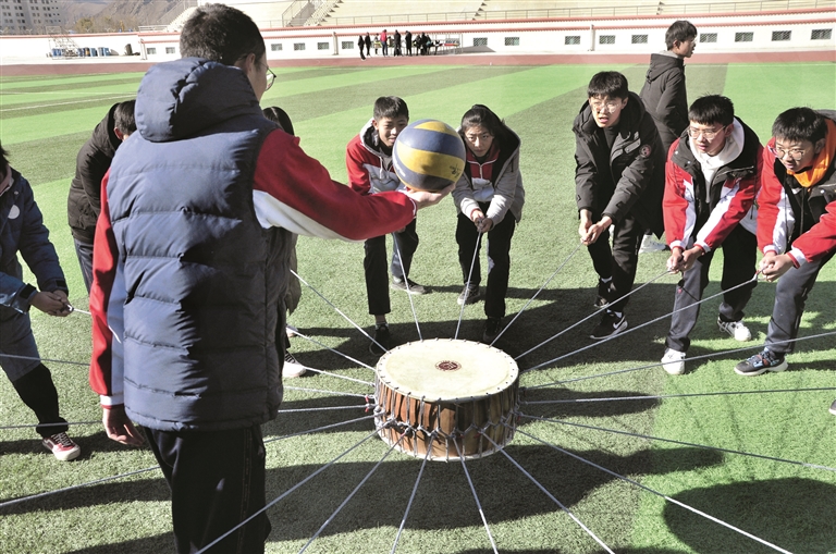 上午10時,課間操時間,拉薩北京中學(xué)全體學(xué)生集中在學(xué)校操場,在西藏塔嘎布體育發(fā)展公司教練的帶領(lǐng)下,該校兩個班級50多名學(xué)生興高采烈地參與到拓展運動中,一起進(jìn)行“花開花落”“擊鼓顛球”“動力繩”等7個項目的拓展運動訓(xùn)練。同學(xué)們通過共同合作完成指定運動,在歡笑聲中一起進(jìn)行趣味運動。拉薩北京中學(xué)相關(guān)負(fù)責(zé)人表示,此次趣味體育拓展活動不僅有利于促進(jìn)學(xué)生的心理素質(zhì),還能增強(qiáng)學(xué)生之間的團(tuán)隊意識,希望同學(xué)們積極參與、發(fā)揚體育精神。