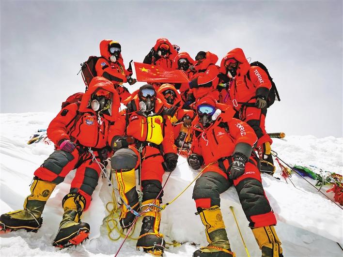 5月27日,2020珠峰高程測(cè)量登山隊(duì)成功登頂世界第一高峰珠穆朗瑪峰。他們?cè)诜屙斬Q立覘標(biāo),安裝GNSS天線,開(kāi)展各項(xiàng)峰頂測(cè)量工作。45年前的這一天,中國(guó)人首次將覘標(biāo)帶至珠峰峰頂。新華社特約記者 扎西次仁 攝