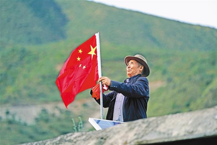 9月25日,在西藏昌都市江達(dá)縣崗?fù)写?,普巴在屋頂上換上嶄新的國(guó)旗,這是他每月進(jìn)行一次的“儀式”。今年是昌都解放70周年,普巴說(shuō),現(xiàn)在我們的美好日子,是解放軍用生命和鮮血換來(lái)的,這份恩情,我們不會(huì)忘記。新華社記者 詹彥 攝