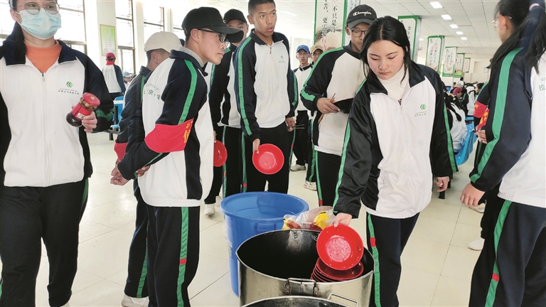 中午13時,在拉薩北京實(shí)驗(yàn)中學(xué)食堂里,學(xué)生有序排隊(duì)取餐,根據(jù)“吃多少拿多少”的原則進(jìn)行點(diǎn)餐。用餐結(jié)束后,學(xué)生排隊(duì)放置碗筷,記者注意到,大多數(shù)學(xué)生用過的餐碗非常干凈,沒有浪費(fèi)主食的情況,用來裝食物殘?jiān)你锼袄锊]有多少被倒掉的殘羹剩飯。
