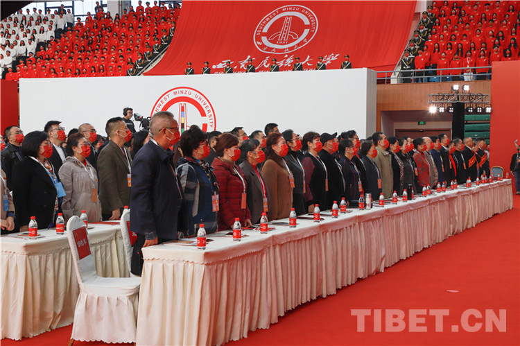 大會(huì)在雄壯的國(guó)歌聲中拉開(kāi)帷幕,西南民族大學(xué)黨委書(shū)記楊敏宣布慶祝大會(huì)開(kāi)始。
