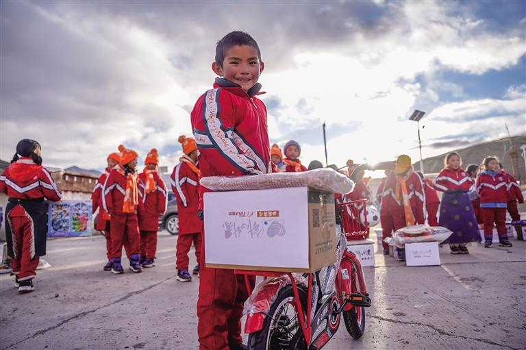 足球、籃球、奧特曼玩具、芭比娃娃、遙控飛機(jī)、自行車……孩子們欣喜地接過(guò)心心念念的禮物,迫不及待地玩耍起來(lái),紅彤彤的臉上流露出純真的笑容。