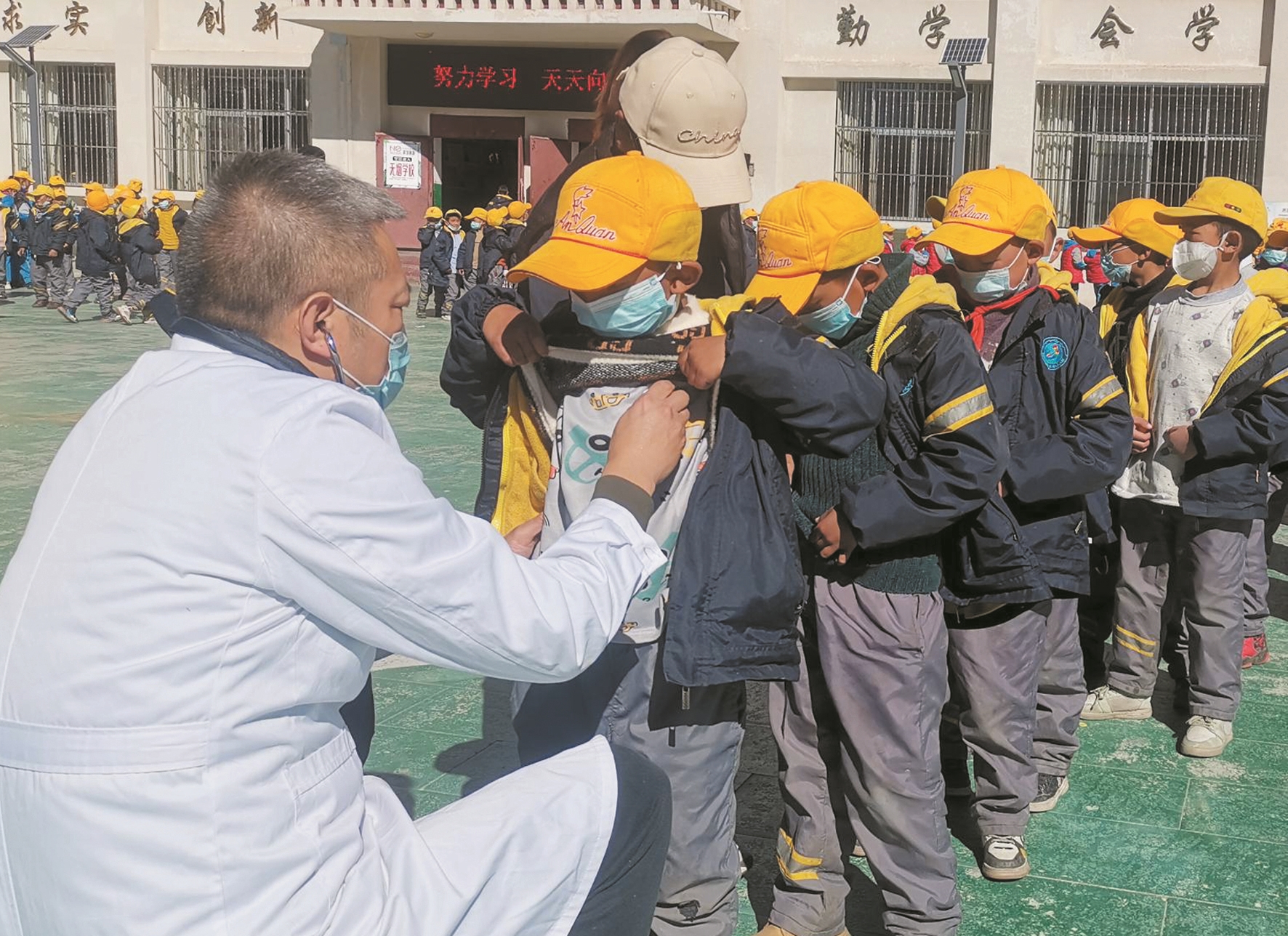 圖為醫(yī)療專家為墨竹工卡縣尼瑪江熱鄉(xiāng)小學(xué)的學(xué)生進(jìn)行聽(tīng)診器檢查。拉薩融媒記者 白 央攝