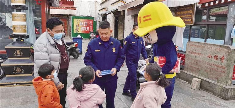消防人員給小朋友發(fā)放“消防小禮品”。記者 旦增貢嘎 攝