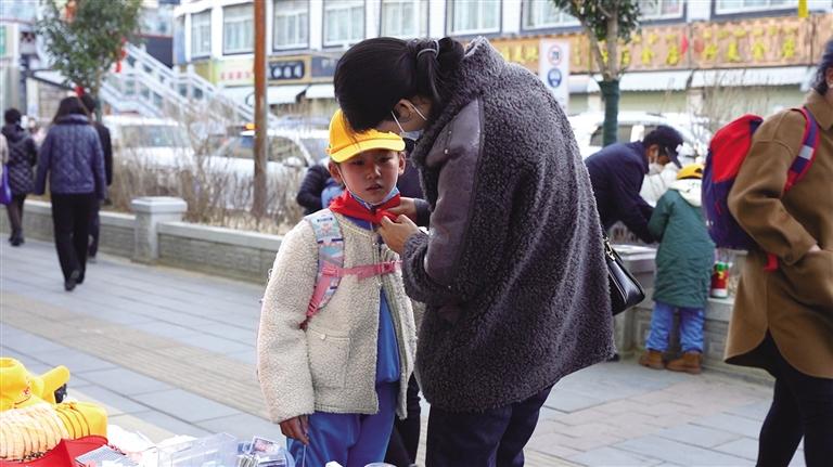 10日早上8時(shí)20分許,小學(xué)生們佩戴鮮艷的紅領(lǐng)巾、頭戴小黃帽,陸陸續(xù)續(xù)走進(jìn)拉薩市第一小學(xué)的校門(mén)。今年春季開(kāi)學(xué)第一天,有些家長(zhǎng)蹲在孩子面前,幫忙整理衣帽,同時(shí)鼓勵(lì)孩子“加油!”。