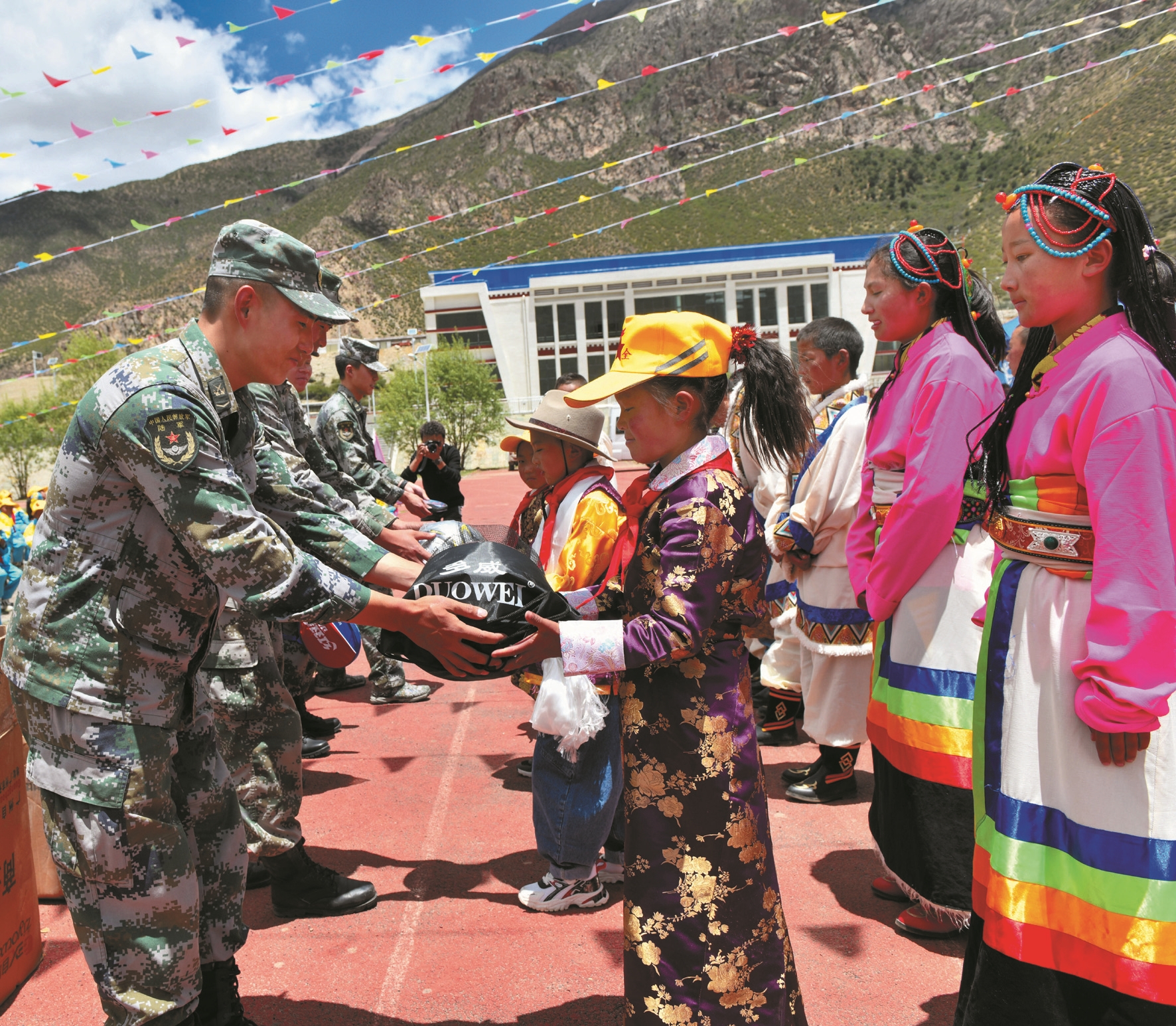 圖為活動現(xiàn)場,西藏軍區(qū)某部戰(zhàn)士向阿朗鄉(xiāng)中心小學(xué)學(xué)生捐贈愛心物品。(市委宣傳部駐拉康村工作隊供圖)