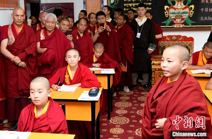 6月16日,西藏佛學(xué)院少年活佛在教室內(nèi)向班禪介紹自己的學(xué)習(xí)情況。中新社發(fā) 李林 攝