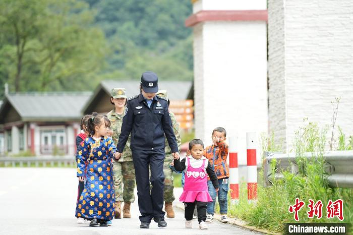圖為戍邊民警與駐地部隊(duì)官兵攜龐達(dá)村雙語幼兒園小朋友行走在村里。 李錦輝 攝