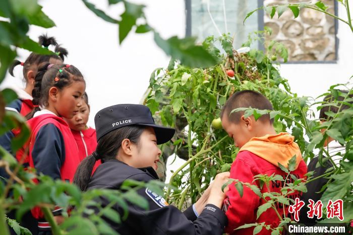 圖為亞東出入境邊防檢查站民警楊琳帶著龐達(dá)村雙語幼兒園小朋友認(rèn)識(shí)成熟了的西紅柿?!±铄\輝 攝