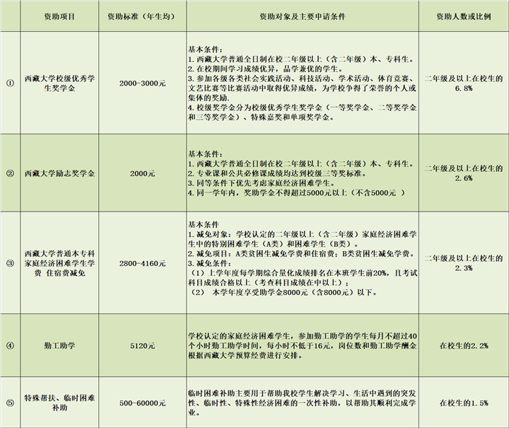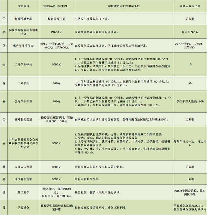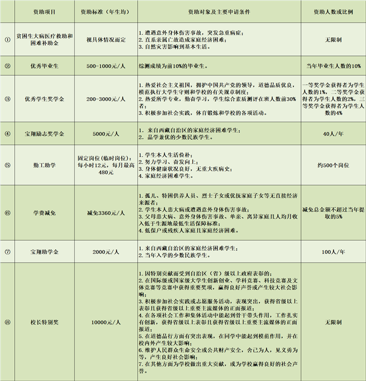 這些資助項目包括國家政策、西藏自治區(qū)政策和西藏各高校的政策,全部列出了明確的申請條件,涵蓋了學(xué)生生活、學(xué)習(xí)的方方面面。其中,有的項目針對家庭經(jīng)濟困難的學(xué)生給予學(xué)費、住宿費等的減免;有的項目為學(xué)生提供各種校內(nèi)勤工助學(xué)機會,讓學(xué)生通過勞動獲得報酬;有的項目獎勵入伍,有的項目獎勵發(fā)明創(chuàng)造……并且,西藏各高校在制定資助政策時體現(xiàn)出了各學(xué)校鮮明的辦學(xué)特點。例如,西藏藏醫(yī)藥大學(xué)設(shè)置了面向所有學(xué)生的“記誦《三部醫(yī)典》獎”,要求“熱愛社會主義祖國,擁護(hù)中國共產(chǎn)黨的領(lǐng)導(dǎo);遵紀(jì)守法,遵守學(xué)校規(guī)章制度;背誦學(xué)生按‘三部醫(yī)典’章節(jié)順序依次背誦。在背誦過程中,要吐字清晰,聲音宏亮,總時間不能超過2個小時?!狈彩沁_(dá)到要求的學(xué)生,獎勵1800元。