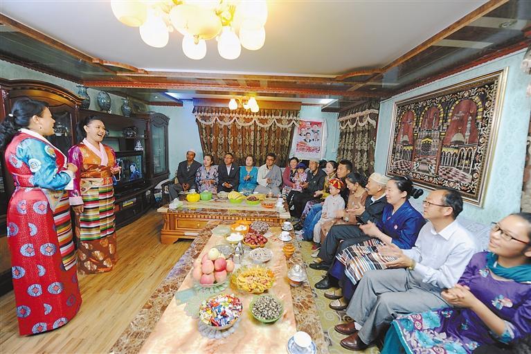 著力創(chuàng)建全國民族團結(jié)進步模范區(qū)。截至2022年5月,全區(qū)共有國務(wù)院、西藏自治區(qū)表彰的民族團結(jié)進步模范集體1934個,模范個人2846人。圖為2021年2月13日,西藏自治區(qū)拉薩市吉崩崗社區(qū)各族群眾在同一天共度農(nóng)歷新年和藏歷新年。