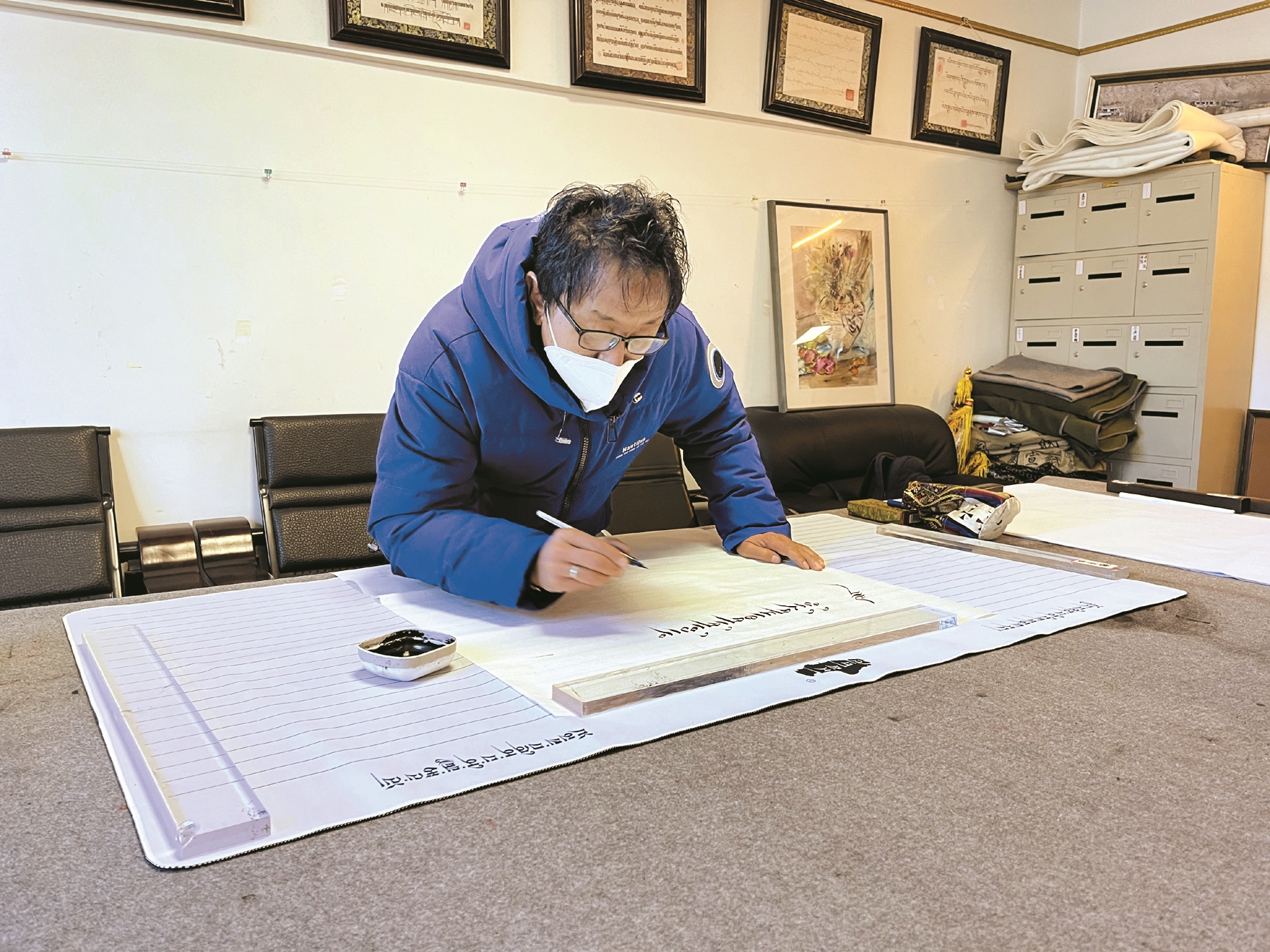 圖為市書法家協(xié)會(huì)副主席南杰旺扎正在書寫黨的二十大報(bào)告金句。 拉薩融媒記者 莫瑞英攝