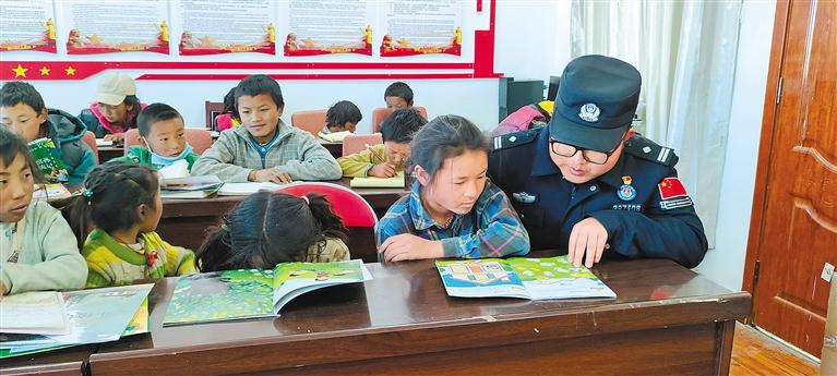 日喀則市曲龍貢達村駐村工作隊(西藏邊檢總站派駐)開設(shè)小課堂,為中小學(xué)生免費提供制作手工、課外讀物講解等服務(wù)。圖為駐村隊員劉海鵬為學(xué)生講解課外讀物。記者 盧文靜 攝