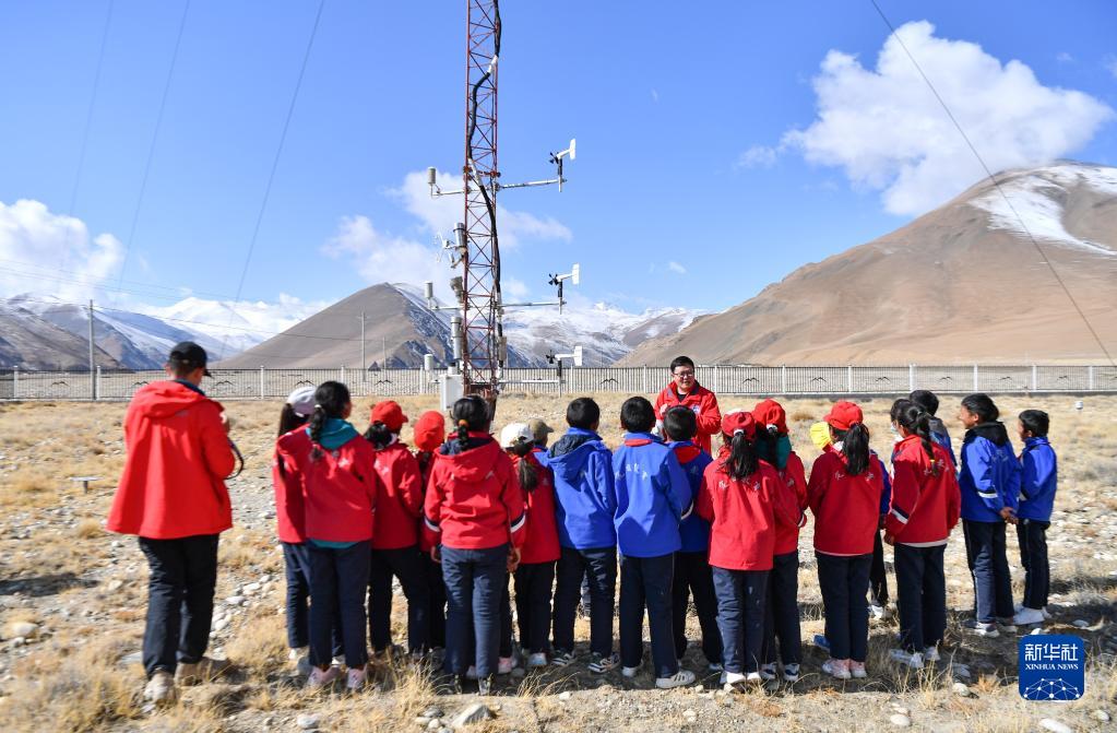 5月15日,珠峰站工作人員席振華給孩子們講解科學(xué)儀器的功能作用。新華社記者 晉美多吉 攝