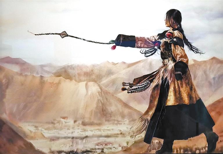 中國畫作品《幸福西藏》運用工筆重彩的繪畫藝術(shù)表現(xiàn)形式,描繪了布達拉宮廣場上民族和睦的美好生活圖景。畫面中,湛藍天空下,藏族群眾與遠道而來的各地游客們相聚雪域高原,燦爛的笑容映照出新時代西藏人民的美好生活,也反映出西藏自然風(fēng)光、人文風(fēng)情對各地游客的極大吸引力。從青年旅行者們或騎著單車,或舉起相機認真拍照的表情,能深刻感受到他們對美麗西藏的向往。同時,繪畫作品反映出近年來西藏旅游事業(yè)的蓬勃發(fā)展以及各族兒女團結(jié)互助、攜手進步的新時代美好生活景象。水彩·粉畫《颯·薩》運用人物特寫的藝術(shù)創(chuàng)作手法,展現(xiàn)出一位西藏姑娘甩出烏爾朵的颯爽姿態(tài);油畫《藏歷新年薩迦禳祈?!芬悦骺鞜崃业纳屎嫱谐霎?shù)孛癖娺M行藏歷新年祈?;顒拥臍g樂場景;油畫《中國玉麥》以紀實敘事的創(chuàng)作方式,描繪了隆子縣玉麥鄉(xiāng)卓嘎、央宗姐妹放牧守邊的故事,畫面中她們專注地懸掛國旗的樸實舉動,傳遞出高原姊妹對祖國的深愛之情。