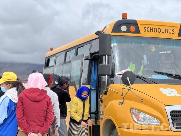 上午十一點,穿著牧區(qū)藏袍、頭戴淺色頭巾的婦女和紅色“扎秀”(辮尾)的男士背起牛羊毛編織的背包,牽著自家小孩的手紛紛到達集合點。“校車來啦!”學(xué)生們在村委會院子里自覺排起了隊。