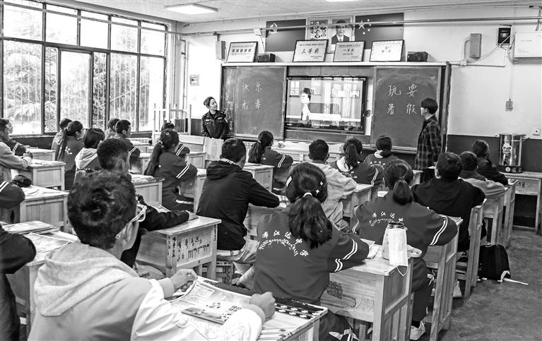 工布江達縣公安局禁毒大隊民警與拉薩市職業(yè)技術學院志愿者在縣中學向?qū)W生播放禁毒宣傳片。記者 彭琦 實習生 旦增旺姆 攝