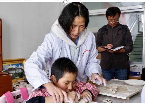 圖為陶藝室內(nèi),陳雙燕和學(xué)生在捏泥巴。