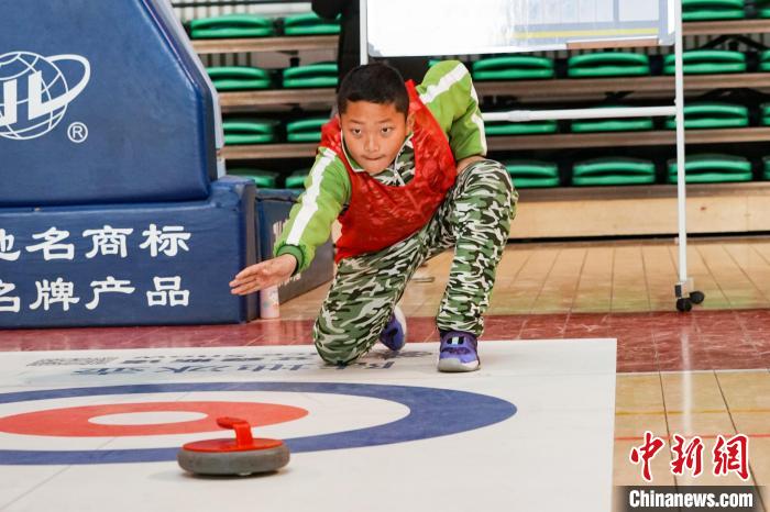 圖為在青海民族大學(xué),一名校園組選手在陸地冰壺比賽中投壺。 馬銘言 攝