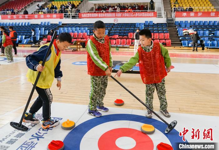 圖為在青海民族大學(xué),校園組選手正在進行陸地冰壺項目的比賽。馬銘言 攝