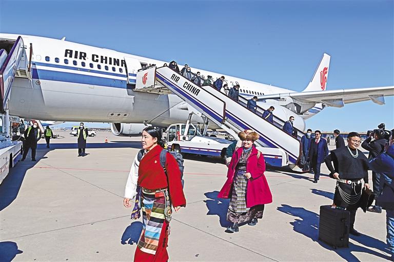 圖為西藏參加全國兩會的代表委員乘機(jī)抵達(dá)北京。記者 旦增西旦 攝