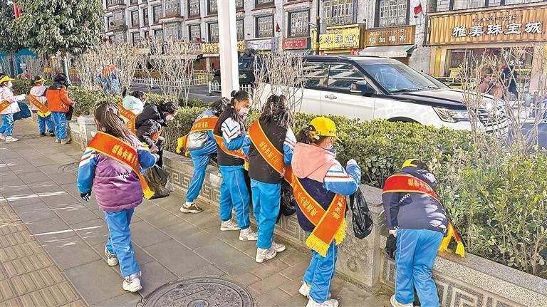 圖為拉薩市第一小學(xué)小小志愿者們沿街清掃。記者 格桑倫珠 攝