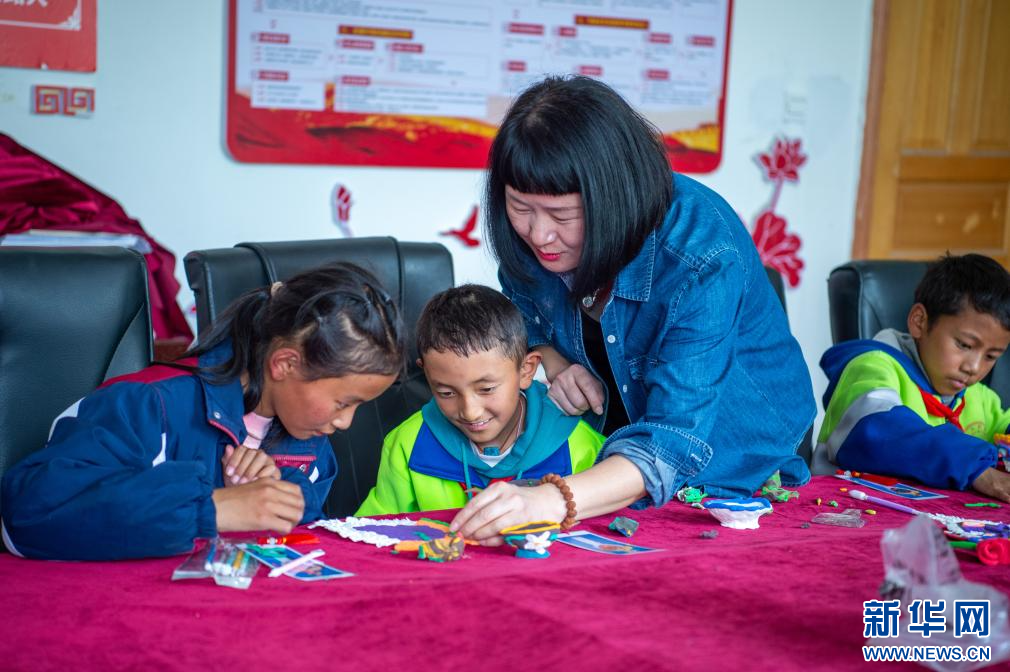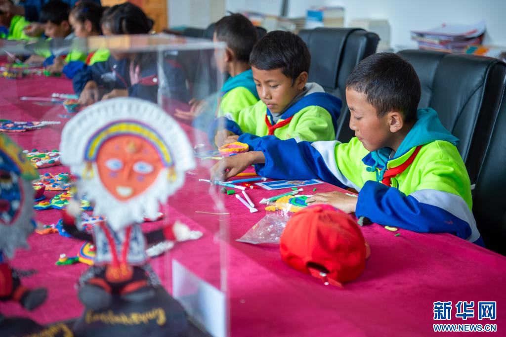 6月21日,乃東區(qū)亞堆鄉(xiāng)小學(xué)的學(xué)生在興趣課上制作藏戲面具造型。新華網(wǎng) 旦增努布 攝