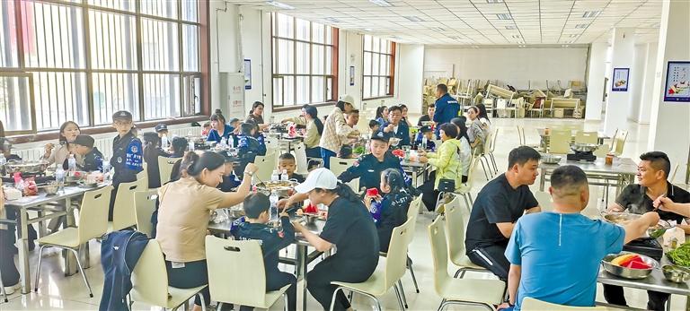 圖為警屬和警娃們?cè)诎⒗锏貐^(qū)公安處特警支隊(duì)食堂吃飯。